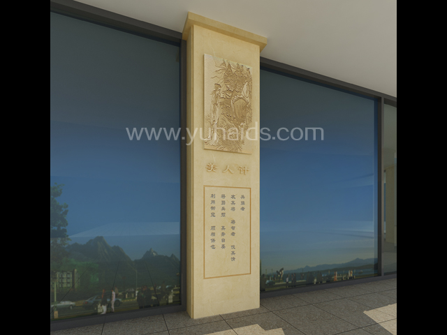 這是一個會所走廊的柱子浮雕效果設計方案,以優(yōu)質(zhì)黃金麻石材為材質(zhì)配以浮雕的形式雕刻裝飾畫及文字內(nèi)容。柱面尺寸為4400-1100mm。