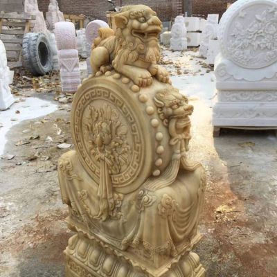 庭院門口擺放漢白玉浮雕獅子門墩石雕