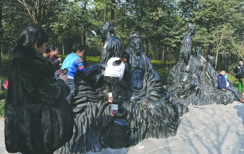 浣花溪公園的詩歌典故園內,在雕塑“飲中八仙”上,兩名小孩正興奮地爬上爬下,大人則站在一旁吃小吃。詩歌大道上,杜甫、李白和屈原三位詩人的大型集體雕塑平臺上,盡管立有“為了您的孩子的安全,請勿在雕塑臺上嬉戲”的告示牌,卻仍有4名小孩在“詩人”身旁爬來爬去,一位女士只在一旁叮囑:“慢點,不要碰到頭了”。